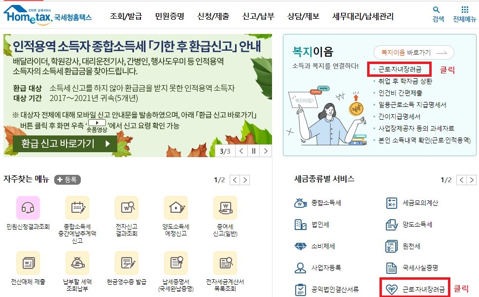 인터넷홈텍스 접속 → 신청/제출 메뉴 또는 복지이음 배너 '근로.저녀장려금' →