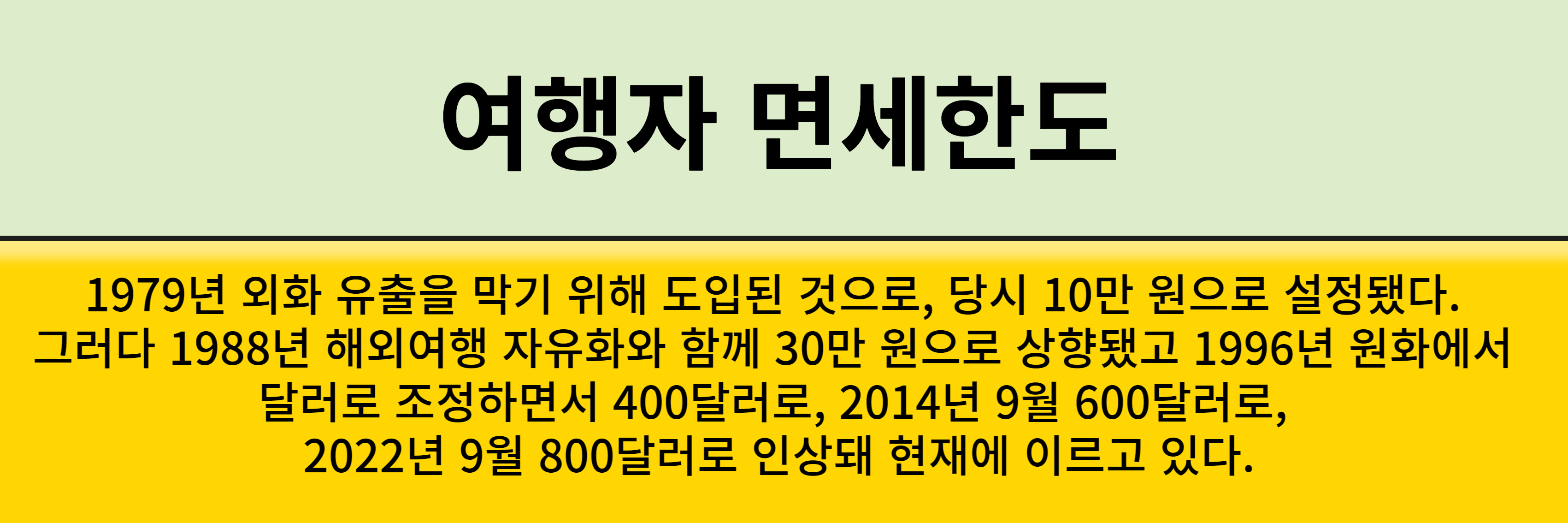 처음에는 10만 원으로 설정되었지만 시간이 지나면서 1988년에는 30만 원으로 상향되고, 1996년에는 원화가 달러로 조정되면서 400달러 그리고 2014년 9월에 600달로 상향, 8년이 지난 후에야 800달로 조정이 되었습니다.