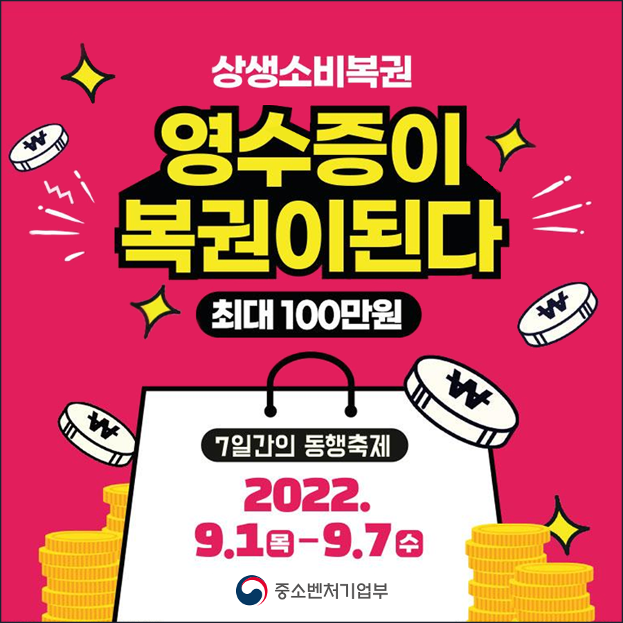 안녕하세요. 추석을 앞두고 소비지출이 많다 보니 지갑이 가벼워지고 있습니다. 코로나 금리인상으로 다들 어렵지만 다들 힘내셨으면 합니다!! 9월 1일부터 ~ 9월 7일까지 "7일간의 동행 축제"가 열리며 "상생소비복권" 이벤트를 진행한다고 합니다. 3만원의 영수증이 100만원 당첨금으로 내 지갑이 두둑해질 수 있습니다