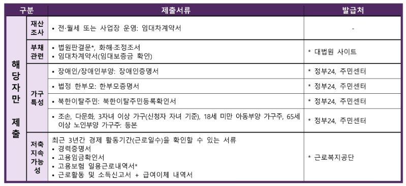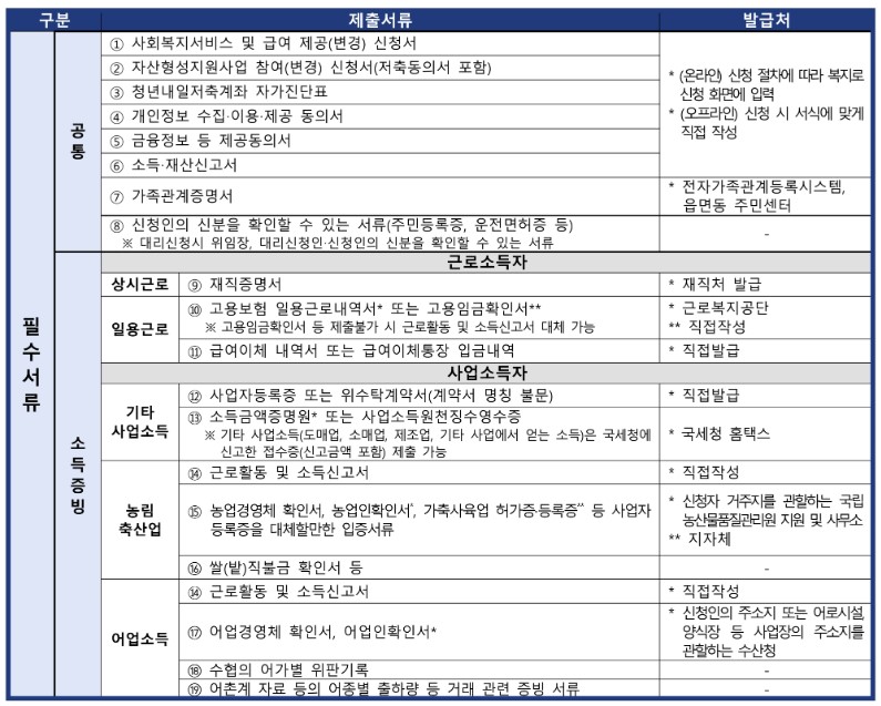 ✅ 서류미비 시 보장기관에서 별도요청 하였음에도 기한 내 서류완비가 되지 않을 경우 지원대상에서 제외됩니다. 각 소득‧재산 사항은 행복e음(사회보장정보시스템) 조회 결과를 우선 적용합니다.