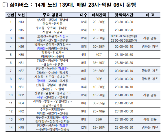 - 심야버스 14개 노선 139대가 매일 23시 ~ 익일 06시 정상 운행 중
