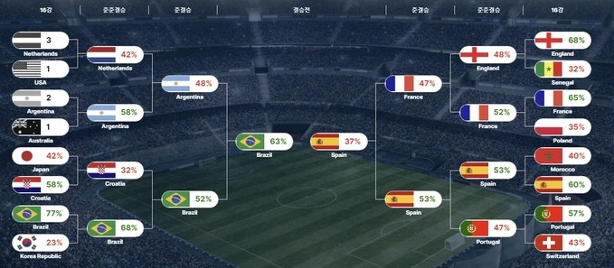 포르투갈 11% 확률 보다는 높게 나왔는데 11%의 확률도 뚫고 16강 진출을 하였습니다.