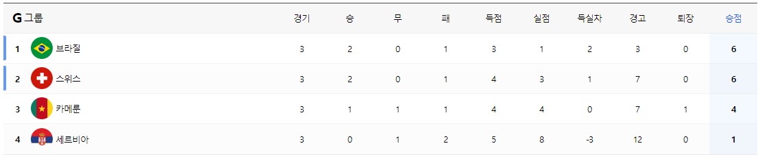 G조 조별리그 순위