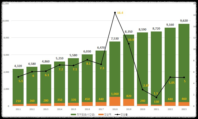 10년 전 4,860원이었는데 2023년도 최저임금은 9,620원으로 거의 두배 정도 상승한 거 같습니다.
